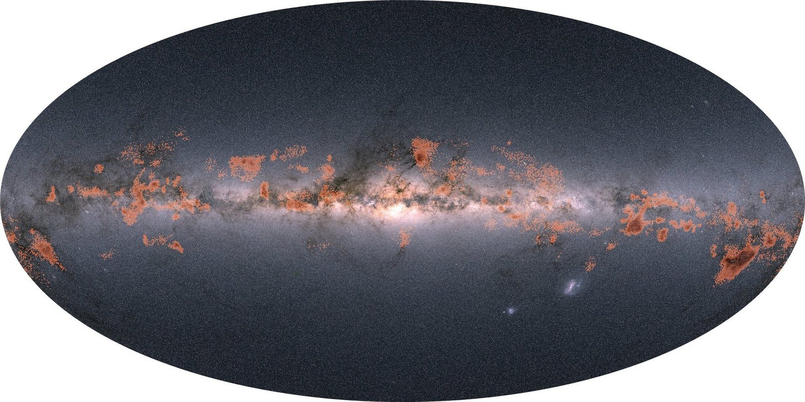 Gaia’s all-sky view of our Milky Way Galaxy and neighboring galaxies. The maps show the total brightness and colour of stars (top), the total density of stars (middle) and the interstellar dust that fills the Galaxy (bottom). These images are based on observations performed by the ESA satellite in each portion of the sky between July 2014 and May 2016, which were published as part of Gaia second data release on 25 April 2018. Courtesy ESA/Gaia/DPAC; Maps: CC BY-SA 3.0 IGO